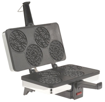 OUT OF STOCK • Makes four 3-1/4” pizzelles at a time • 750 Watts • Steam guard protect hands • Extra thick baking plates ensure even heat distribution • Cone roller included