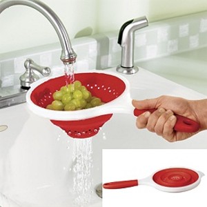 *DISCONTINUED* This space-saving strainer/colander pops open for service, closed for storage in a drawer or sliver of cabinet space. The silicone surface prevents sticking of pasta and starchy vegetables. Lipped edge rests over a pan or bowl. Top-rack dishwasher-safe Strainer. 8"dia.x3.75"H (16" with handle) 1289