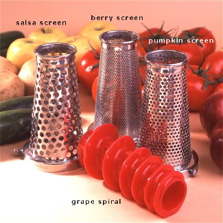 Buy them as a kit and save or buy them individually depending on your needs! This 4-piece accessory kit makes the Roma Food Strainer and Sauce Maker the most versatile tool in any kitchen! Kit includes: Berry Screen (3/64" holes) Pumpkin/Squash Screen (1/8" holes) Salsa Screen (1/4" holes) Grape Spiral (5-1/2" long) Make your own salsa; strain the seeds from strawberries to make your own jellies; create puree for pumpkin pie from scratch with little effort! The Grape Spiral allows the Roma to strain grapes while separating the seeds and skins for home-made juices--great for the home wine maker! This accessory kit WILL fit the VILLAWARE #200 tomato and food strainer. It WILL NOT fit the 200 deluxe strainer.