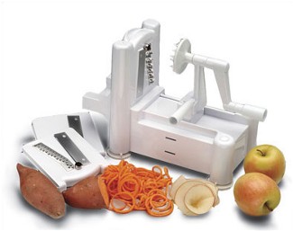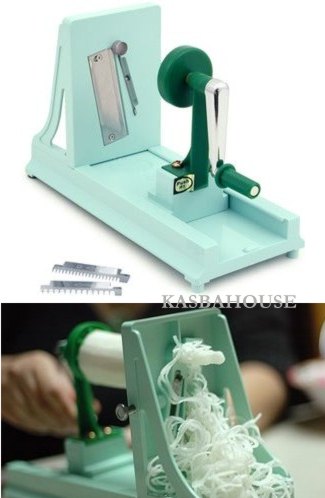 Spiral Slicer ''The Original''. Food is more than just food in Asian cuisine. It's art for the table, and much thought and care goes into creating magnificent garnishes. While you may have thought such culinary feats were beyond your technical skills, think again. This spiral slicer does the hard part for you. Use your imagination and produce the most beautiful of pizza toppings, salads, soups, potato nests, and of course garnishes. Precision stainless steel blades, plastic body Rotate handle to slice Clear cover and collection bowl Switch blades for strands, ribbons or slices By precutting you can also make tiny cubes or julienne strips Make onion rings, potato nests, quick cooking veggies, pizza toppings, salads and more Works with any firm fruit or veggie (apples, sweet potatoes, onions, zucchini, cucumber and more)