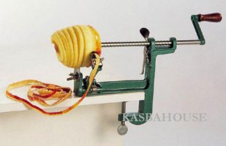 This apple peeler/corer/slicer has a carbon steel arched blade and an L-shaped stainless steel blade. It is constructed on an epoxy steel frame. It takes approximately 15 seconds to prepare an apple or a pear. made in France by KALI