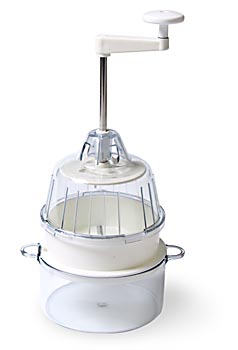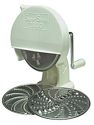 Use this practical slicer/shredder for all jobs, big or small! Practical and simple design is easy to use without the mess of large food processors. It feeds from the back and comes with an attached food feeder that pushes the food down. The large slicing disk is for slicing potatoes, carrots, onions, cucumbers, beets, apples, and other fruits and vegetables. This blade reverses for french fry cuts. The medium grater disk is for coarse or medium shredding of potatoes, carrots, celery and other vegetables, and it reverses from a very coarse to medium coarse. The other disk is a fine grater for bread crumbs, cheese, nutmeg, nuts, chocolate, carrots, and potatoes. Suction base. blades are dishwasher safe. 10.25" high - blades are 6.25" diameter. Made in Italy