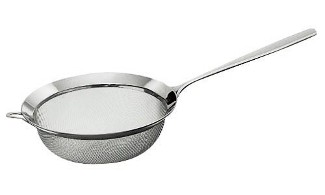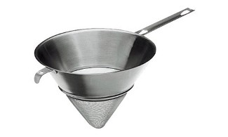 -DISCONTINUED ITEM- This SS fine mesh chinois strainer will strain any food in seconds. Durable and easy to clean it comes with an extra long handle to rest across large sauce pots. Made in Italy