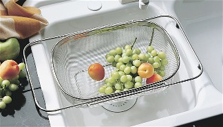 -DISCONTINUED-The Colander is made of professional gauge fine stainless steel mesh. The two locking handles can be extended to straddle the sink for easy draining and rinsing of vegetables and fruits. Rubber feet keep the draining basket in place. Perfect for draining pasta, rinsing spinach or fresh greens, berries, grapes and much more. 20-1/2" x 9"