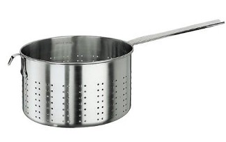 Pasta Strainer with Hook, Stainless Steel. The shape and design of this long handles strainer allows for rapid, efficient water draining. Made in Italy by Paderno. Sizes are: 1.2 lbs/3qts/ diam. 7 1/8"x H 4 3/8"; 1.6 lbs./5 1/4qts/ dia 8 5/8"x H 5 1/8"; 1.9 lbs./9 7/8 qts/ dia 11"x H 5 7/8
