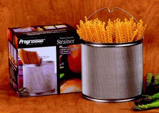 *DISCONTINUED* This space-saving strainer/colander pops open for service, closed for storage in a drawer or sliver of cabinet space. The silicone surface prevents sticking of pasta and starchy vegetables. Lipped edge rests over a pan or bowl. Top-rack dishwasher-safe Strainer. 8"dia.x3.75"H (16" with handle) 1289