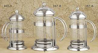 -DISCONTINUED ITEM- Press Pots are the most natural way to brew. Simply place your course ground coffee or tea into the carafe, pour in hot water and allow to steep,then push down. The fine stainless mesh screen forces the grinds to the bottom, pour out the finished brew. Thermal Coffee Press. Keep your coffee or tea hot and fresh! Our glass lined 4 cup Coffee Press features a stainless screen for smooth brewing action. The unit is constructed of a shock resistant ABS plastic body, finished with in black and chrome for added elegance. Gift Boxed. 20 oz. brewing capacity. Made in Taiwan