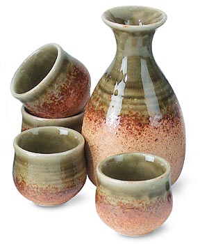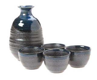 -DISCONTINUED- Reactive glazes in blue tones offer a natural and tranquil feeling to this traditional sake set. Contrasts in matte vs. gloss texture add interest to the simple forms. Japanese porcelain Set includes decanter 3" diameter x 4 3/4" h, 4 cups 1 3/4" diameter x 1 5/8" h Hand wash