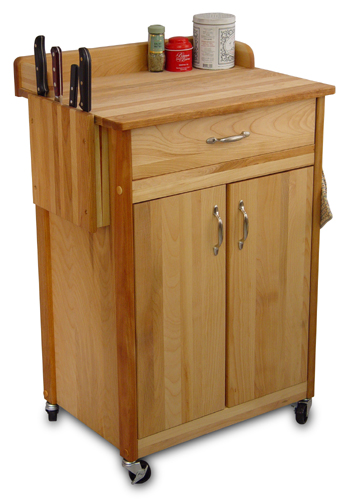 A knife rack and back-splash galley are two features that make this a great food prep station. This cart features a hardwood, food-safe butcher block top, hardwood drawer, doors, legs and braces with warp-resistant veneer side and back panels ke 1524