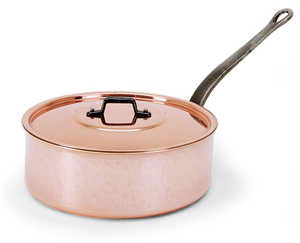 Constructed of solid copper, this saute pan is lined with tin for safe cooking. Its proportions create a generous sauce-to-air ratio for quick evaporation. The outer surface is polished.