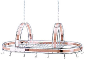The copper and chromed-steel hanging rack comes with eight stainless steel hooks and a grid for both hanging and storing items.