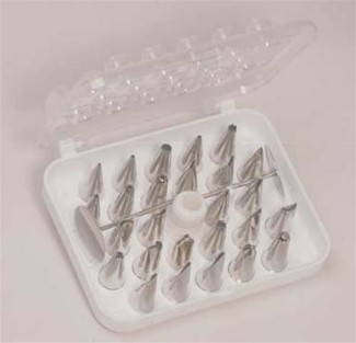 Set includes 26 decorating tubes, 2 flower nails and standard coupler