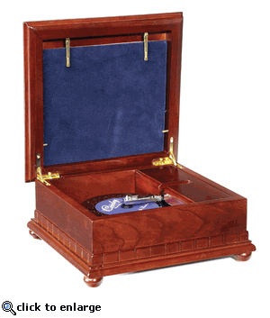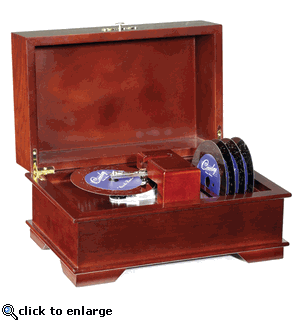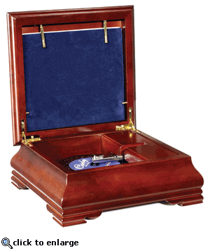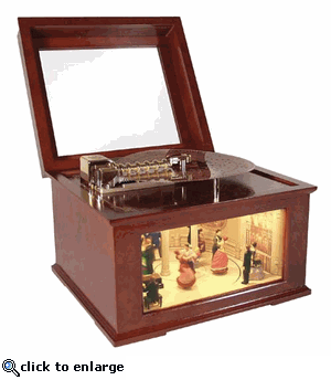 This burl wood finish music box has sixteen figurines (five couples dance around a lighted ballroom.