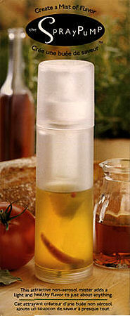 Polycarbonate hand operated spray pump for use with a variety of oils and dressings.