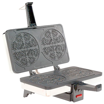 makes 2 5" krumkakes or very thin pizelles at a time 750 watts syeam guard protects hands