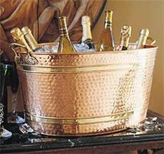 -Hammered copper oval party tub -Brass handles and accents -Great functional piece outdoors or inside, it will hold a party's worth of beverages and keep them cool. -Protective lacquer to retard tarnishing -Measures 25 by 16 by 12 inches. Made in India