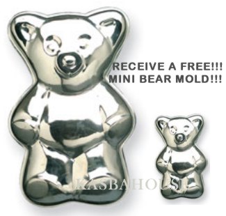 Tinplate bear mold for making beautifully shaped cakes for baby showers, birthdays and any occasion. 7 cup capacity. 11 inches. Made in Portugal. FREE!!! with the purchase of each bear mold, receive a FREE mini teddy bear mold (1/2 cup capacity) - perfect if you have any cake mix left or for making individual little bear desserts! (while supplies last)