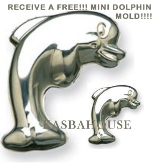 Tinplate dolphin mold for making beautifully shaped cakes for baby showers, birthdays and any occasion. 4 cup capacity. 11 inches. Made in Portugal. FREE!!! with the purchase of each dolphin mold, receive a FREE mini dolphin mold (4 inch) - perfect if you have any cake mix left or for making individual little dolphin desserts! (while supplies last)