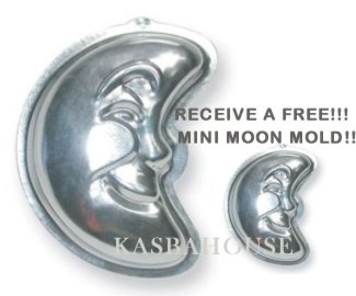 -DISCONTINUED- Tinplate moon mold for making beautifully shaped cakes for baby showers, birthdays and any occasion. 5 cup capacity. 8 1/2 x 5 inches. Made in Portugal. FREE!!! with the purchase of each moon mold, receive a FREE mini moon mold (3 1/2 inch) - perfect if you have any cake mix left or for making individual little moon desserts! (while supplies last)