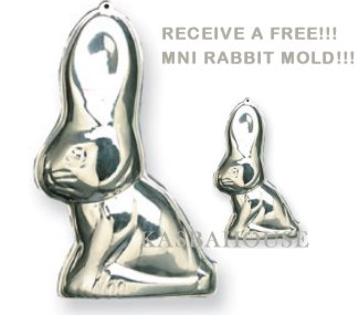 Tinplate rabbit mold for making beautifully shaped cakes for easter celebrations, birthdays and any occasion. 5 cup capacity. 12 inches. Made in Portugal. FREE!!! with the purchase of each rabbit mold, receive a FREE mini rabbit mold (1/2 cup capacity) - perfect if you have any cake mix left or for making individual little rabbit desserts! (while supplies last)