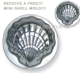 Tinplate shell mold for making beautifully shaped cakes for partes, birthdays and any occasion. 5 cup capacity. 11 inches. Made in Portugal. FREE!!! with the purchase of each shell mold, receive a FREE mini shell mold (1 cup capacity) - perfect if you have any cake mix left or for making individual little shell desserts! (while supplies last)