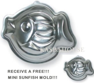 Tinplate sunfish mold for making beautifully shaped cakes for baby showers, birthdays and any occasion. 6 cup capacity. 10 inches. Made in Portugal. FREE!!! with the purchase of each sunfish mold, receive a FREE mini sunfish mold (3 1/3 inch) - perfect if you have any cake mix left or for making individual little sunfish desserts! (while supplies last)
