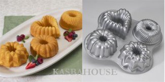 *DISCONTINUED* Nordic Ware's heavy cast aluminum provides superior results. Baked goods rise more evenly and cook more uniformly with delicious golden crusts. Heat reflective exterior ensures uniform browning Non stick surface makes clean up easy Makes 4 - 2¼ cup cakes Made in the USA