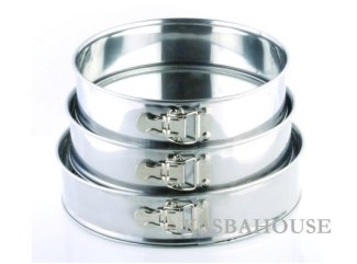 Set of 3 practical springforms. Sides open for easier removal and to insure minimal breakage. Ideal for cheesecakes, pound cakes, tortes and other desserts. Set includes 8" diameter, 9" diameter and 10" diameter forms. Made in Chile