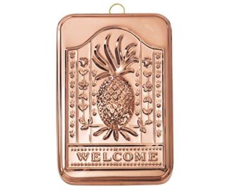 Gorgeous WELCOME solid copper mold. 1 quart capacity; 10" x 7". Traditional brass ring permits hanging flat against wall -Protective coating prevents tarnishing if used only as decoration -Lined with nickel. Made in India.