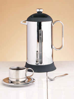 -DISCONTINUED ITEM- Press Pots are the most natural way to brew. Simply place your course ground coffee or tea into the carafe, pour in hot water and allow to steep,then push down. The fine stainless mesh screen forces the grinds to the bottom, pour out the finished brew. Thermal Coffee Press. Keep your coffee or tea hot and fresh! Our glass lined 4 cup Coffee Press features a stainless screen for smooth brewing action. The unit is constructed of a shock resistant ABS plastic body, finished with in black and chrome for added elegance. Gift Boxed. 20 oz. brewing capacity. Made in Taiwan