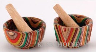 -DISCONTINUED- Beautifully decorated; hand dyed wood mortars & pestles in 2 different shapes. 3.5 inches diameter; pestle is 3.75 inches long. Made in Thailand