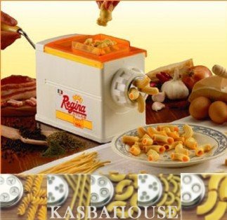 The Regina Atlas is a manual machine for making pasta by extrusion. Comes complete with seven interchangeable dies for producing Rigatoni, Maccheroni, Maccheroncini, Bucatini and Fusilli. The machine is made entirely of plastic for foodstuffs. The control handle and the locking clamp are made of chrome-plated steel and shockproof plastic. The five dies are made of plastic for foodstuffs and chrome-plated steel. The size of the Extruder measures 10 x 5 x 7.5-in. 5 different dies available for making 5 different types of pasta (pictured below). Made in Italy