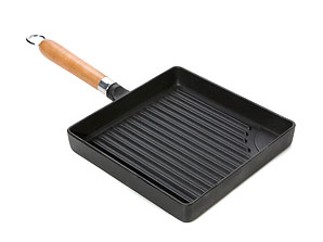 Cast iron japanese grill with enamel coating and maple wood handle. 9" x 9" square. By Joyce Chen