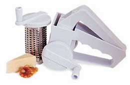 Popular at Italian Tables everywhere. Finely shreds hard cheeses into delicate strands.. Second drum grates coarse. Also for nuts, chocalate and vegetables.