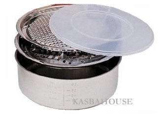 Stainless steel with 2 grating disks and plastic storage lid. 8" diameter x 2.5 high Graduated bowl markings of 16, 24 and 32 oz., 18/8 stainless, China 7.375" wide, 2.5" high,