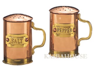 - OUT OF STOCK - A seasoned cook will enjoy the beauty and warmth of these salt and pepper shakers. Each shaker sparkles with a mirror finish and is crafted from copper with a brass base and accents. A plaque is riveted on the side with either 'Salt' or 'Pepper' and the riveted handle is left unpolished for better gripping. They both have nickel-lined interiors and a plastic plug on the underside for filling with salt or pepper. The shakers have a nice weight to them and the hole patterns are identical. Lacquers are used to prevent tarnishing and to maintain the polished look. While copper cookware often comes with a lacquer that needs to be removed before use, the lacquer on the salt and pepper shakers does not require removal. Size is 2 3/4 inches high.