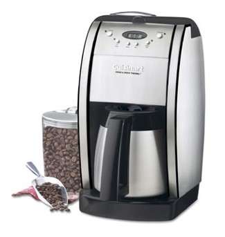 OUT OF STOCK DGB-600BC: For the freshest and most flavorful coffee, this stylish coffeemaker grinds your beans right before brewing. Its double-wall, insulated, brushed stainless steel carafe keeps up to 10 cups of coffee hot for hours. Incorporates 24-hour programmability, a Brew Pause™ feature, 1–4 cup setting and automatic shut-off after brewing. Gold-tone filter included. Three-year limited warranty. Manufacturer: Cuisinart Includes: Measuring scoop with brush, instruction book, four basket paper filters Care: Do not use scouring agents or harsh cleansers on any part of the coffeemaker; never immerse base unit in water or other liquid. Capacity: 10 cups Dimensions: 7˝" x 8" x 15" Weight: 12 lbs. Material: Stainless steel housing Warranty: 3-year limited warranty