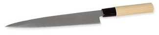When it comes to precision kitchen tasks, having the proper tool makes all the difference in terms of results, and stress reduction for the cook. If you've decided to tackle sushi-making at home, by all means equip yourself properly. This knife is identical to those used by sushi chefs. In the traditional Japanese manner, the thin blade is sharpened on the right side only. A single edge cuts more cleanly and faster than a double edged knife. High carbon stainless steel blade with precision ground edge and ho wood handle 8'' L blade Balanced and durable Ideal for slicing fish, seafood, and other ingredients for sushi and sashimi. Holds a razor sharp edge. Will not discolor or transfer metallic taste to food. (Wash by hand and dry immediately)