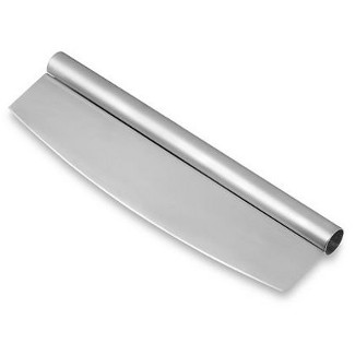 ***out of stock*** For pizzas or a safe way to chop vegetables. Brushed stainless steel. 14" length Heavy weight, professional quality knife. This impressive tool cuts thin or deep-dish pizza into uniform sections. Made of heavy-gauge stainless steel, the cutter has an integral rolled handle that runs the blade’s length. Simply grasp the handle at opposite ends, use a rocking motion, and the ultrasharp blade quickly portions your pizza. Dishwasher safe. 14" long.