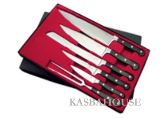 Professional Grade, premium quality knife set includes: 4 1/4" paring knife, 6" boning knife, 6" meat fork, 8" cook knife, 9" wave edge slicer, 10" cook knife. Beautiully boxed.