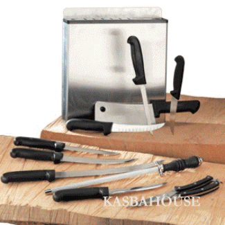 A fine set of knives is the most essential tool for any chef or butcher.... and these fit the bill perfectly! High grade SS constructions and sharpened to perfection. Non slip poly handles shaped for a comfortable grip. Stores neatly in a restaurant sty;e SS rack that can be mounted anywhere. Set includes: 6" granton edge curved boning knife; 6" straight boning knife; 6" straight super narrow boning knife; 12" sharpening steel; 8" breaking knife; 12" narrow steak knife; 7" cleaver; 5" poultry knife; heavy duty poultry shears. rack included.