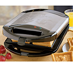 *** OUT OF STOCK! *** Bakes two classic American waffles with Pooh's and Tigger's faces classic chrome housing with commemorative Pooh & Tigger etching, ready light tells when to start baking and when waffles are done, automatic thermostat control, Xylan non stick coating, cool touch handles with clip, stands on end for convenient storage , wafflers