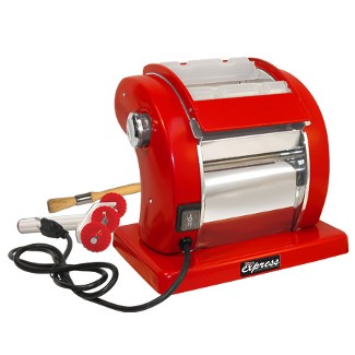 Roma Express. 01-0601-W. For the economy minded.. this pasta machine is comparable to machines costing up to 4 times more! The Roma Express pasta machine is an electric pasta machine that allows you to enjoy making pasta effortlessly. It includes a safety switch that immediately cuts power to the motor when the safety cover is opened ; fast and slow speed controls; adjustable knob to contraol dough thickness. This machine has a one year warranty. Dimensions are: 12.3" x 13.5" x 11". This machine does not have optional attachments. Features: Nine adjustable settings! from paper thin to 1/8 inch thick; 5 and 3/4 inch wide rollers (146mm); Includes adjustable wheel and cleaning brush; shipping weight, 18 lbs. Made in China. FREE!!!! Receive with the purchase of every Roma express, a practical pasta drying rack to complete the set! (while supplies last).