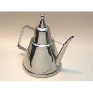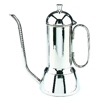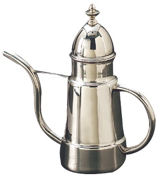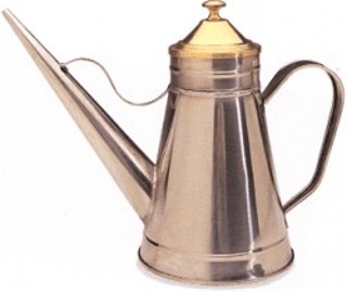 Traditional type, pours a very thin stream of oil. stainless steel brass lid 8oz capacity.