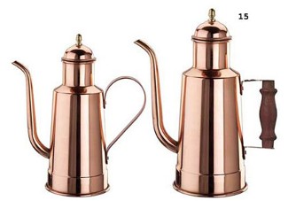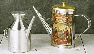 Oil servers - For Home or Restaurant use. Our serving cans are a gourmet’s delight. Choose from 2 classics: our unusual “milk jug” designs and our decorated oil can (decorated on both sides) Use for oil, vinegar or anything that requires a chef’s touch! Item 72 is out of stock