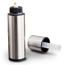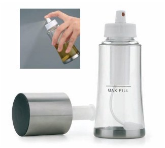 -DISCONTINUED- For spraying foods with a fine mist of oil, our nonaerosol mister performs well with olive oils flavored oils, vinegars, etc. This simple tool provides precise control over the amount of oil you use, which makes it ideal for low-fat cooking. Its clear container allows you to view the contents, and a quick pump of the top cap increases the air pressure inside for easier spraying. Made in Spain