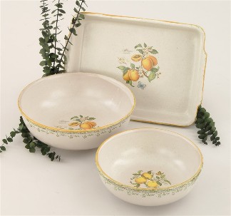 Bake and serve a whole italian meal with a touch of class : lasagna pan, salad bowl and pasta bowl. All beautifully hand painted in Italy. Buy them as a set and save, or buy them individually. Lasagna pan is 16" x 11" Salad/pasta bowls are: 9.5" and 12" inches diameter. Lasagna pan is oven proof - instructions are included. Salad/pasta bowls can be used on microwave oven for reheating. Dishwasher safe. Hand decorated terra-cota Made in Italy the set is as seen on amazon