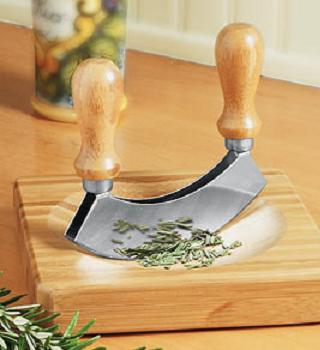 This double-handled mezzaluna has dual stainless steel blades and durable, eco-friendly wood handles. The double blades and ergonomic handles make chopping herbs, onions and nuts a breeze. Perfect for smaller chopping jobs. Great for herbs, onions, nuts and more. Double handle is easier on the hands. 6 inch size. Made in Italy. **board is not included**