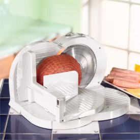 Slice Your Own Cold Cuts - Thick To Thin. Turn left-overs into fabulous deli-style sandwiches...carve a roast into perfect slices before a dinner party...slice firm cheese, bread, fruit and vegetables, too! Our ultra-compact Electric Meat Slicer has an adjustable dial that lets you slice wafer-thin to thick-n-chunky - just the way you like it. Food pusher keeps fingers safe. Stainless steel blade removes for easy cleaning. ETL Listed. 8½''Hx14''Wx10½''D; folds to just 3¾''D for compact storage.