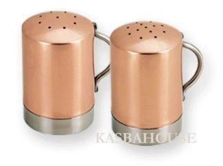- OUT OF STOCK - A seasoned cook will enjoy the beauty and warmth of these salt and pepper shakers. Each shaker sparkles with a mirror finish and is crafted from copper with a brass base and accents. A plaque is riveted on the side with either 'Salt' or 'Pepper' and the riveted handle is left unpolished for better gripping. They both have nickel-lined interiors and a plastic plug on the underside for filling with salt or pepper. The shakers have a nice weight to them and the hole patterns are identical. Lacquers are used to prevent tarnishing and to maintain the polished look. While copper cookware often comes with a lacquer that needs to be removed before use, the lacquer on the salt and pepper shakers does not require removal. Size is 2 3/4 inches high.